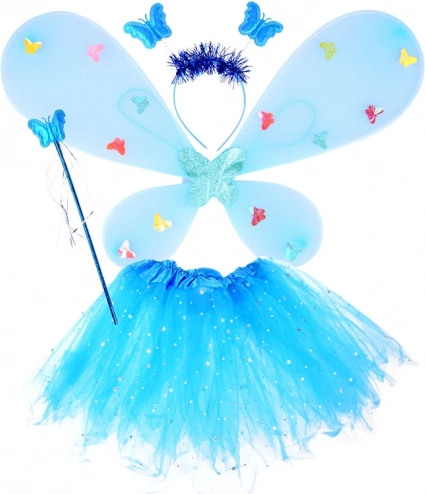 Dit prachtige feeënkostuum in blauwe kleur zal elk klein meisje blij maken. Het kostuum omvat een rok met LED-verlichting, vleugels, een haarband en een toverstok, en biedt een magische ervaring voor elke gelegenheid.