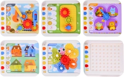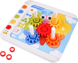Kleurige tandwielen en blokjes ontwikkelen de fijne motoriek en het begrip van mechanica. Door één tandwiel te draaien komen de anderen in beweging – plezier dat oorzaak en gevolg leert.