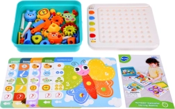 De set bevat een elektronisch paneel, een lade voor onderdelen, 5 thematische kaarten, kleurige blokjes en tandwielen, dierenfiguren (giraf, konijn, muis, leeuw) en een kleurrijk geïllustreerd boekje. Het kind kan bewegende constructies bouwen, de oog-handcoördinatie ontwikkelen en tandwielmechanica begrijpen. De rode knop op het paneel start extra uitdagingen voor nog meer plezier.