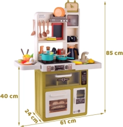 Deze interactieve keuken geeft kinderen een authentieke kookervaring. Hij is uitgerust met een fornuis met twee kookplaten, een oven, een koelkast, een vaatwasser, een gootsteen met functionele kraan in een gesloten circuit en bovenplanken met haakjes. Na het vullen van het reservoir (ca. 40 ml) stijgt er tijdens het koken realistische stoom op uit één brander en lichten de kookplaten op. De afzuigkap biedt melodieën en geluiden die het spel nog levendiger maken.