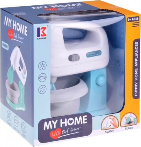 Het speelgoed imiteert een echte keukenmixer met draaiende garde en een blauw lichteffect.