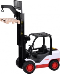 De set bevat een vorkheftruck en een pallet, wat kinderen de mogelijkheid biedt om bouw- en logistieke operaties na te spelen. De vrachtwagen heeft rubberen wielen voor gemakkelijke verplaatsing en een instelbaar hefmechanisme, dat met een hendel bediend kan worden.