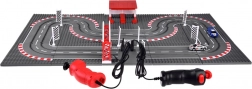 De twee handbedieningen met traploze snelheidsregeling worden aangesloten op het station op de baan en garanderen precieze controle in bochten en op rechte stukken. Dankzij voeding via USB zijn er geen batterijen nodig – gewoon inpluggen en racen. In de doos vind je alles voor een snelle start: