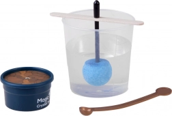 In de set vind je alles wat je nodig hebt: een maatbeker van 200 ml, een zakje met kristalpoeder/zand, een gekleurd kristallen zaadje op een stokje, een roerstokje, een loep voor gedetailleerde observatie, een houten plaatje, een stopper en een klein bloempotje (standaard). De werkwijze is eenvoudig en veilig: volg de instructies en werk met heet water onder toezicht van een volwassene.