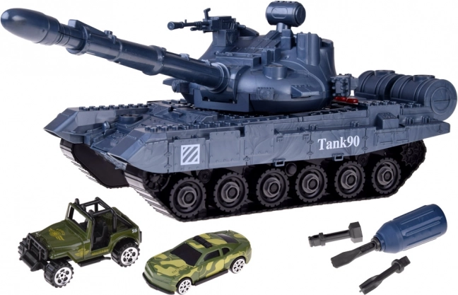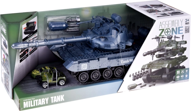 De set bevat componenten voor het monteren van de tank, een schroevendraaier met drie bits en twee militaire voertuigen. Een geweldige uitdaging voor kleine monteurs.