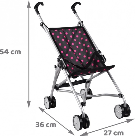 Lichte en compacte poppenwagen in het zwart met roze stippen die elk kind zal verrassen. Dankzij de stevige metalen constructie, comfortabele handgrepen en dubbele wieltjes voor soepel rijden is hij gemakkelijk te besturen en veilig voor dagelijks spel.