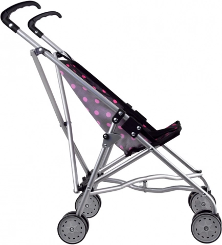 De stoffen zitting in een modern ontwerp in zwart met roze stippen is duurzaam en voelt prettig aan. Dubbele wieltjes garanderen een soepele rit en goede wendbaarheid op diverse ondergronden. Veilige vouw-/uitvouwmechanismen en riempjes in de zitting helpen de pop op zijn plaats te houden.