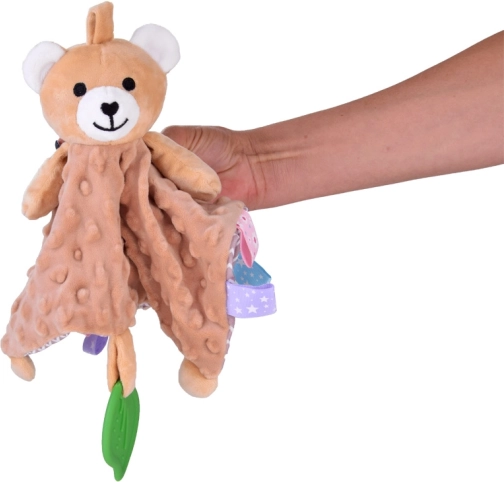 Dit schattige pluchen knuffeldoekje in de vorm van een beertje biedt vanaf de eerste levensdagen zachte troost en zintuiglijke prikkels. Het heeft een superzachte minky-stof met 3D‑stipjes, gekleurde labeltjes om mee te spelen, een siliconen bijtring ter verlichting van het tandvlees en krinkel- en piepelementen die nieuwsgierigheid en zintuiglijke ontwikkeling stimuleren.