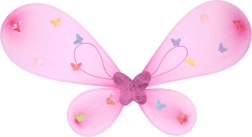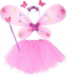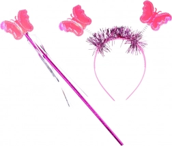 Helder roze vleugels met kleurrijke vlindertjes, aangevuld met een bijpassend toverstokje en haarband – alles in één feeërieke stijl.