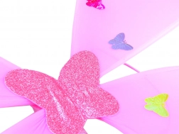 Dit verfijnde feeënkostuum valt op door de helderroze uitvoering en speelse vlinderdecoraties. De tule tuturok met elastische taille is bezaaid met fijne glitters, de vlindervleugels zijn versierd met kleurrijke vlindertjes en het geheel wordt afgerond met LED-lichtjes voor een prachtig effect in de schemering.