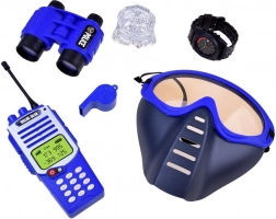 • Complete uitrusting: vest, speelgoedwapen, walkietalkie, verrekijker, fluitje, horloge, masker/bril, handboeien, badge.
