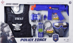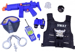 SWAT-vest, speelgoedwapen, walkietalkie (3× AG13 inbegrepen), verrekijker, fluitje, horloge, beschermend masker/bril, handboeien, badge