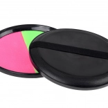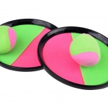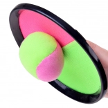 Het gedeelde vangoppervlak in neon groen en roze met klittenband grijpt de bal direct vast – ideaal om nauwkeurigheid en reflexen te trainen.