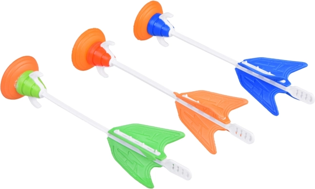 Drie gekleurde pijlen van zacht schuim met zuignap hechten goed op gladde oppervlakken en zijn vriendelijk voor meubels en muren. Ideaal voor precisiewedstrijden en leuk mikken.