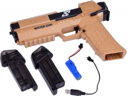 De ingebouwde 3,7 V / 500 mAh accu laad je op via de USB-kabel (inbegrepen). Twee verwisselbare reservoirs verlengen het speelplezier zonder vaak bij te vullen. Ideaal voor in de tuin, bij het zwembad en op het strand – veilig, actief en verfrissend plezier voor het hele gezin. Laad de accu op vóór het eerste gebruik.