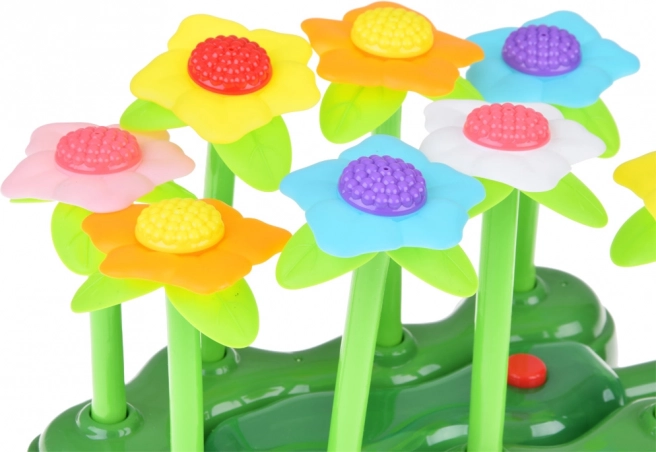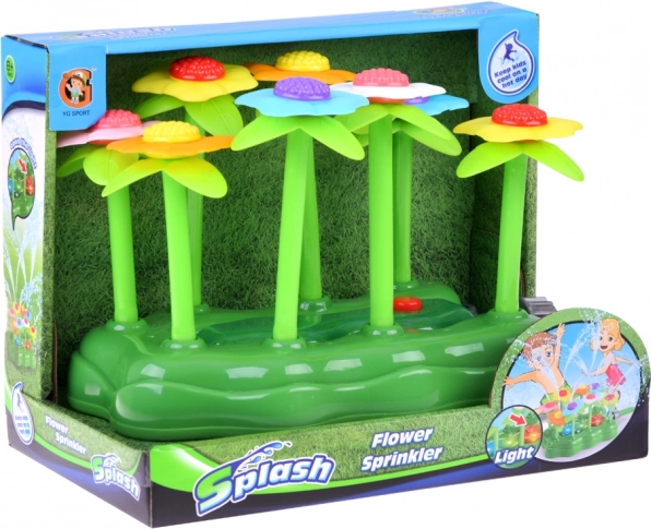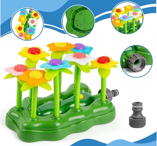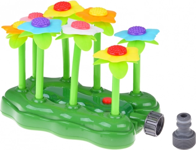 Kleurige bloemen golven mee met de waterstroom en sproeien in alle richtingen – ideaal voor zomers speelplezier op het gazon.