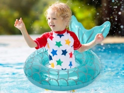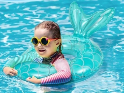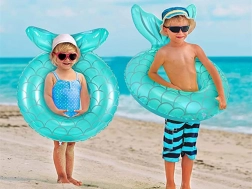 De turquoise kleur en schubbenprint trekken de aandacht op het strand en bij het zwembad en motiveren kinderen om actief in het water te bewegen.