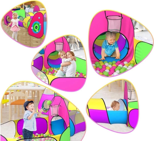 Creëer voor kinderen een eigen speelwereld met deze veelzijdige 5-in-1 set van tenten en tunnels. Combineer tot vijf elementen in verschillende opstellingen voor uren aan creatieve, bewegingsgerichte en sensorische pret. De set is opvouwbaar, licht en draagbaar en geschikt om binnen én in de tuin mee te spelen. Inclusief doelschijf voor werpen met klittenbandballen, ballenbak/box voor baby’s voor ballen en eenvoudige koppeling via tunnels.