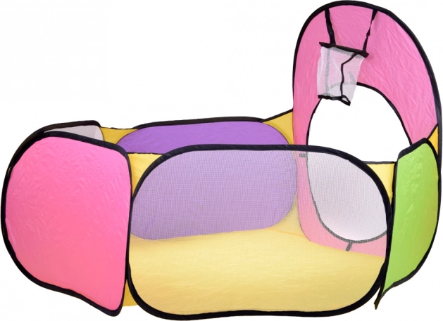 Elke tent biedt andere activiteiten: de driehoekstent met doelschijf en openingen voor werpen met klittenbandballen, de vierkantstent met twee ingangen en de mogelijkheid om tunnels aan te sluiten, en de tent – ballenbak/box ideaal voor een droge ballenbak (ballen niet inbegrepen). Kleurrijke panelen en mesh-delen ondersteunen visuele stimulatie en toezicht door volwassenen.