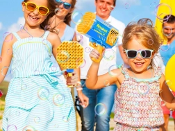 Het bellenblaaspistool is een unieke bubbelmachine omdat het geen ingebouwd reservoir voor vloeistof heeft. Hoe maken we dan deze prachtige regenboogballen die naar de lucht zweven? Het is eenvoudig! Giet gewoon een kleine hoeveelheid vloeistof, die deel uitmaakt van de set, in een ondiep roze schaaltje en doop het voorste deel van het pistool erin. Richt dan en trek de trekker over. Een adembenemend schouwspel ontvouwt zich voor ons! Uit 40 gaten vliegen ronde, glinsterende vormen, wat vreugdevolle uitroepen bij veel kinderen oproept. En volwassenen zijn ook onder de indruk.