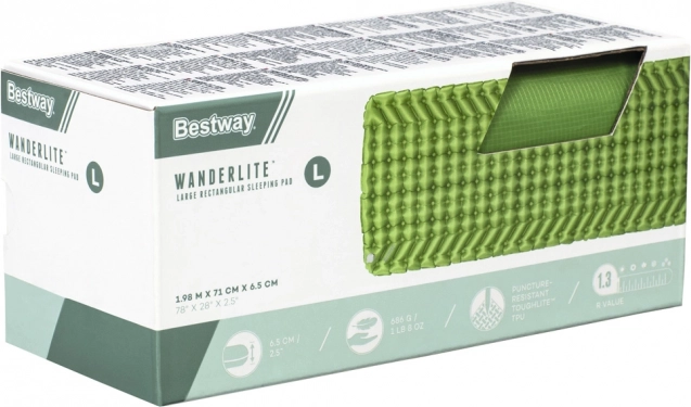 Geniet van een comfortabele nachtrust op elke trip met de opblaasbare slaapmat BESTWAY WanderLite Large. Hij biedt een afmeting van 198 × 71 × 6,5 cm, weegt slechts 686 g en heeft een compacte pakmaat van 10 × 10 × 23 cm. De CrossWing-constructie met schuin geplaatste luchtkamers zorgt voor stabiliteit en comfort, slijtvaste materialen ToughLite en 70D ripstop-nylon doorstaan intensief gebruik en het laagprofielventiel maakt snel opblazen, leeglaten en nauwkeurige hardheidsafstelling mogelijk. De R-waarde 1,3 is ideaal voor warme dagen en zomernachten.