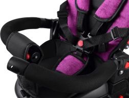 De zitting is in een handomdraai te draaien naar wens. Zachte bekleding, 5-puntsgordels en een afneembare beugel houden de kleine rijder veilig en comfortabel.