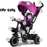 Praktische 3-in-1 kinderdriewieler TINY BIKE met draaibare zitting en zonnekap groeit met je kind mee van 6 maanden tot 5 jaar. Biedt comfort, 5-puntsgordels, een inklapbare kap met gaas, ouderbesturing en onderhoudsvrije EVA-wielen voor veilige en soepele ritjes.