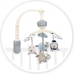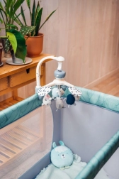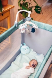 Bijgeleverd zijn zachte sensorische speeltjes van hoogwaardige stoffen (fluweel, vilt) met knisperende en piepende elementen. De speeltjes zijn eenvoudig afneembaar en afzonderlijk te gebruiken of in de wasmachine te wassen. De langzame rotatie ondersteunt het visuele waarnemen en de concentratie van je baby.