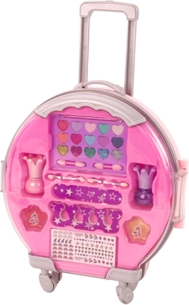 Creatief kinder-make-upkoffertje in roze met wieltjes en handvat, biedt alles voor speels schminken en nageldecoratie. Bevat een palette met 15 tinten, 2 nagellakken, 2 lipglosses, stickers en praktische accessoires. Ideaal voor onderweg en thuis, afmetingen 27 × 30 × 8 cm. Stimuleert creativiteit, veilig speelplezier vanaf 3 jaar, makkelijk mee te nemen.