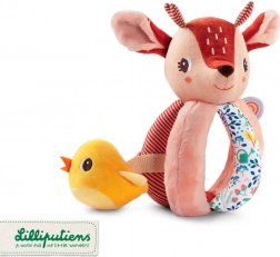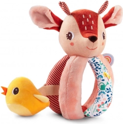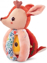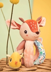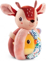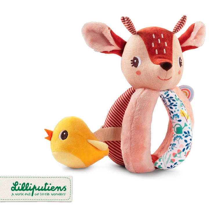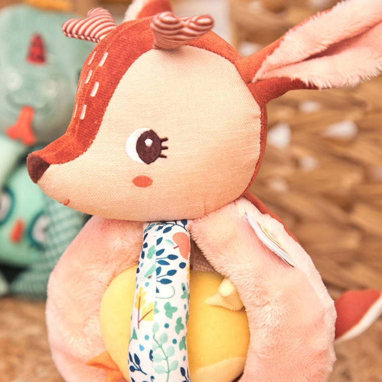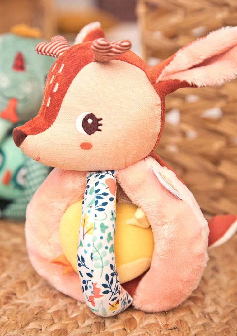 Hertje Stella is een zacht stoffen vriendinnetje dat je baby bezighoudt met grijpen, schudden, instoppen en eruit trekken. Het lichaam bestaat uit een zachte bal met vijf grepen – één met staartje, een andere met knisper en met een getextureerde “regenboog” voor rijke tactiele prikkels. In het hoofdje zit een zacht belletje verborgen, het gele vogeltje aan het lint rammelt prettig en kan naar binnen en buiten worden geschoven.