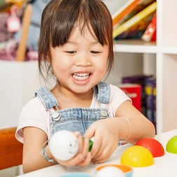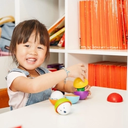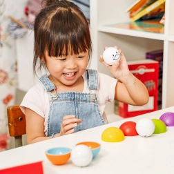 Vrolijke gezichten en levendige kleuren motiveren kinderen om te stapelen, sorteren en verstoppertje te spelen met de balletjes.