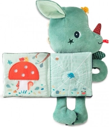 Draak Joe houdt een zacht boekje vol illustraties van bosdieren en magische motieven. De pagina’s knisperen en sommige ratelen om de zintuiglijke waarneming te stimuleren.