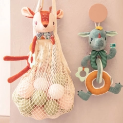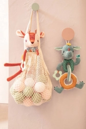 Elk element is van een ander materiaal (bijv. corduroy, zacht “bontje” en andere texturen); één pootje ritselt bij wrijven. Met de koordjes aan het kopje maak je de ketting eenvoudig vast aan kinderwagen, autostoel of draagzak, zodat reizen voor je baby leuker wordt. Het speelgoed is zorgvuldig afgewerkt, veilig en ondersteunt fijne motoriek (grijpen, schudden, openen/sluiten, wrijven) en zintuiglijke ontwikkeling (geluid en tast).