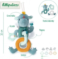 De Lilliputiens sensorische ketting met thema draakje Joe bestaat uit drie zachte schakels die dankzij de middelste ring met magneetsluiting los- en vastgemaakt kunnen worden. In het kopje zit een rammelaar, aan één pootje hangt een getextureerde bijtring in stervorm en aan het andere een sensorische applicatie. De manen, het hoorntje, vleugeltjes, oortjes, lintjes en kleine klauwtjes nodigen uit tot ontdekken en stimuleren de tastzin.