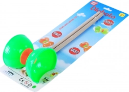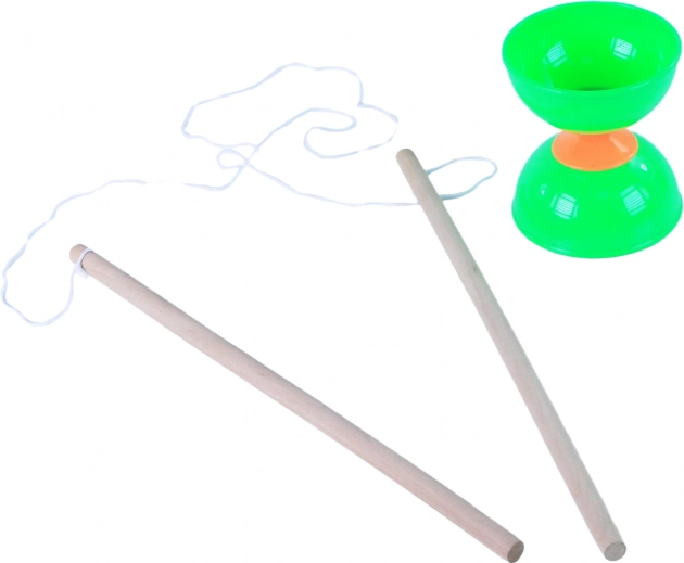 Diabolo speelgoed met groene plastic bekers en houten stokken