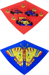 De vlieger is versierd met motieven van raceauto’s en verkeerskegels, wat zijn uitstraling speels en avontuurlijk maakt.