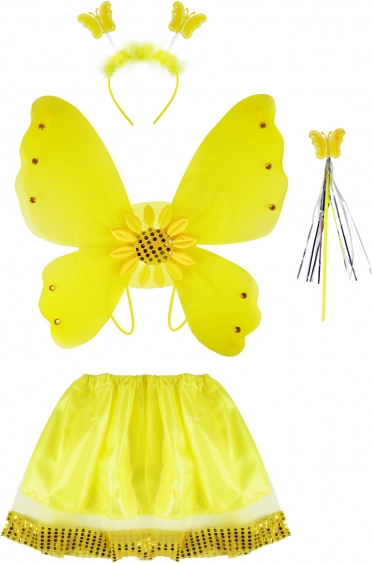 - Vleugels met zonnebloem en steentjes; luchtig rokje met gouden pailletten; diadeem met metallic vlindertjes; toverstaf