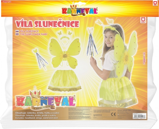 - Inhoud verpakking: vleugels met zonnebloem en steentjes, luchtig rokje met gouden pailletten, diadeem met vlindertjes, toverstaf