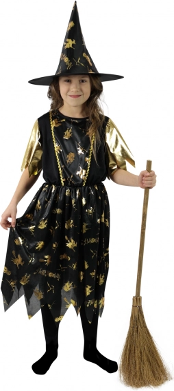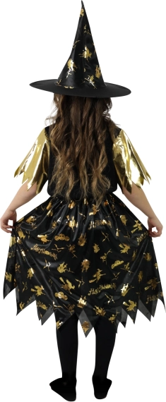 Betover op carnaval en Halloween met dit zwart‑gouden heksenkostuum in maat S voor kinderen van 4–6 jaar (105–116 cm). Fonkelende gouden motieven, een puntige hoed inbegrepen en een comfortabele pasvorm zorgen voor een magische look en prettig draagcomfort.