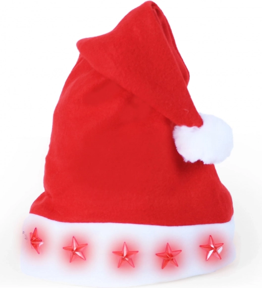 Kerstmuts van vilt met knipperende sterretjes. Eenvoudige bediening met knop, inclusief 2× LR44. Perfect accessoire voor kerstfeestjes en vieringen.