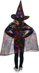 Dit elegante kinderkostuum voor heksen en tovenaars zorgt direct voor effect – trek de cape aan, zet de hoed op en de magische transformatie is klaar. Glanzende, kleurrijk iriserende spinnenwebben geven cape en hoed een opvallende uitstraling en komen perfect tot hun recht op feestjes, in optochten en op foto’s.