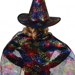 Metallic, multicolor spinnenwebben op de cape en hoed zorgen voor een onmisbare look op elk evenement.