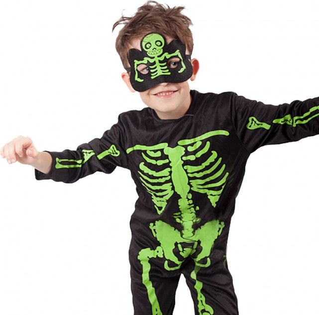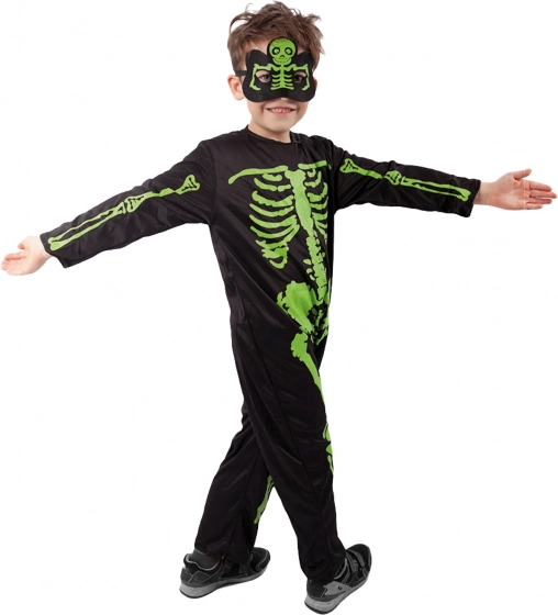 Stijlvol kinderkostuum van een skelet met opvallende neongroene botten op een zwarte achtergrond. Ideaal voor Halloween, carnaval en themafeesten. Inclusief overall en masker voor een complete, griezelige look. Comfortabel materiaal, makkelijk aan te trekken en effectieve neonprint zorgen voor veel plezier en aandacht.