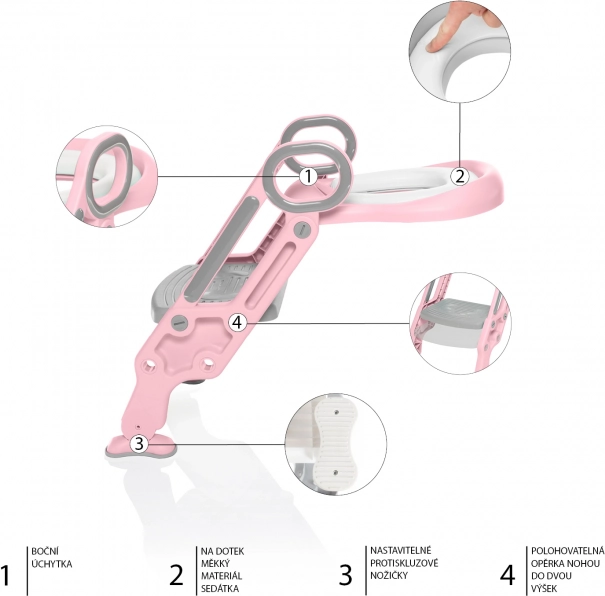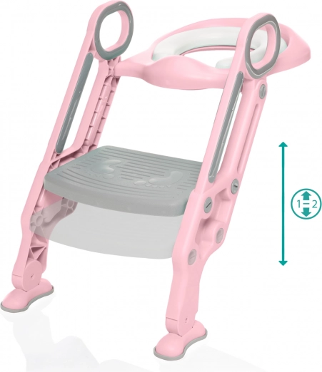 Dankzij de in hoogte verstelbare constructie groeit het trapje mee met je kind totdat het niet meer nodig is. De stevige constructie zorgt ervoor dat je kind zich veilig voelt bij het klimmen en zitten. De poten zijn voorzien van een speciale antisliplaag die stabiliteit en steun biedt. Het trapje heeft bovendien een zachte en comfortabele zitting die als verkleiner voor het normale toilet dient. De anatomische vorm van de zitting, samen met de verhoogde achterzijde, voorkomt ongewenste vervuiling.