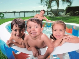 Het familie-opblaaszwembad van BESTWAY biedt verfrissing in de tuin voor zowel kinderen als volwassenen. Het heeft brede, zachte wanden voor comfort, een stabiele I-Beam constructie en een snelaflaatventiel voor eenvoudig leeglaten. Dankzij het lichte PVC-materiaal verplaats je het makkelijk met de zon mee. Geschikt voor kinderen vanaf 6 jaar.