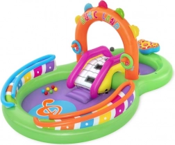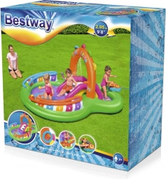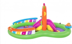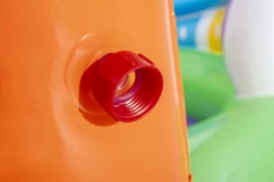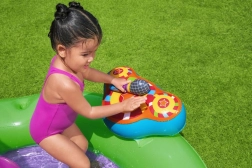 Ontdek en geniet van vele leuke functies met het opblaasbare water-speelcentrum Sing and Splash. Het speelcentrum bevat een microfoon en een trommel waarmee kinderen kunnen spelen en zo hun fantasie prikkelen. De dubbele badjes zijn met elkaar verbonden door een afneembare glijbaan die met touwen en lussen is bevestigd. In de bodem zit een ingebouwd opblaasbaar kussen voor een zachte landing vanaf de glijbaan. De boog met ingebouwde sproeier hoeft alleen op de tuinslang te worden aangesloten. Op de punten van de boog kun je opblaasbare ringen gooien. De set bevat 6 gekleurde ballen die je zowel over de ene als de andere baan naar beneden kunt laten rollen. Deze spelletjes zijn niet alleen leuk, maar stimuleren ook de oog-handcoördinatie.