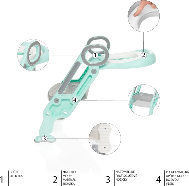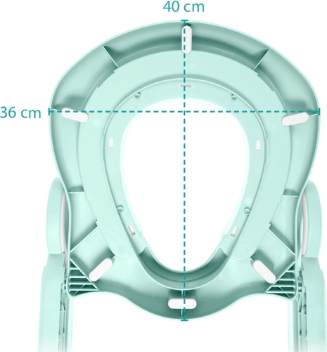 Dankzij de in hoogte verstelbaarheid groeit het trapje met je kind mee totdat het niet meer nodig is. De stevige constructie zorgt ervoor dat je kind zich tijdens het klimmen en zitten veilig voelt. De poten zijn voorzien van een speciale antisliplaag die stabiliteit en steun biedt. Het trapje is bovendien uitgerust met een zachte en comfortabele zitting die als verkleiner voor de gewone wc dient. De anatomische vorm van de zitting, samen met de verhoogde achterzijde, voorkomt ongewenste vervuiling.