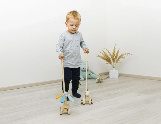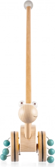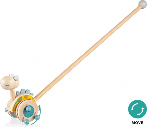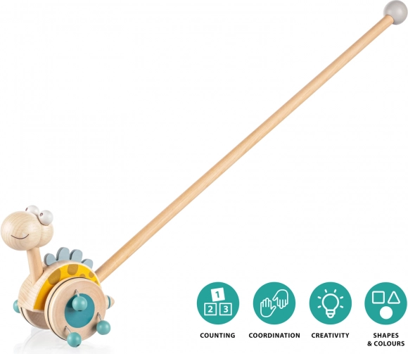 De loopwagen op een lange staaf is het perfecte speelgoed voor kinderen die beginnen met lopen. De dinosaurus op de staaf draait tijdens het bewegen en dankzij de houten kralen op de wielen maakt het geluid dat de aandacht van het kind trekt en het aanmoedigt om te lopen.