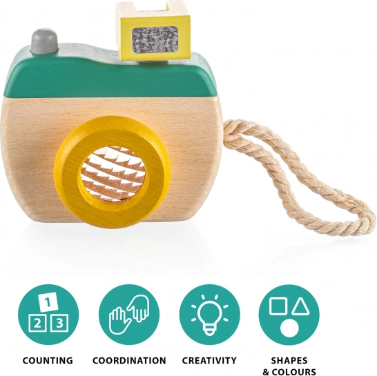 De houten camera is ideaal voor kleine creatievelingen. Het compacte en lichte ontwerp maakt eenvoudige bediening en meenemen mogelijk.
