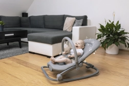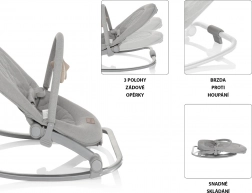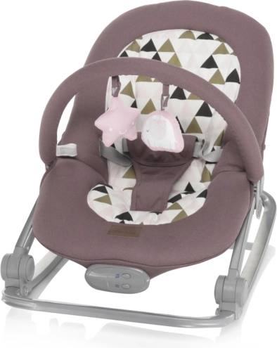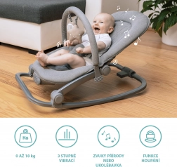 Voor het kalmeren van kinderen biedt het wipstoeltje de mogelijkheid om vibraties afzonderlijk in te stellen en te kiezen tussen wiegeliedjes en natuurgeluiden. De geluidssterkte en trillingintensiteit kunnen in drie niveaus worden ingesteld. De speelboog met speelgoed draagt bij aan het vermaak van de kleintjes.